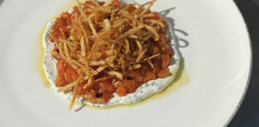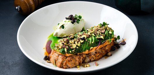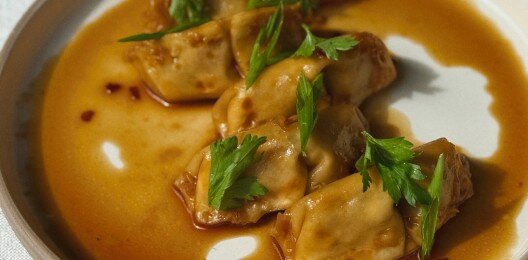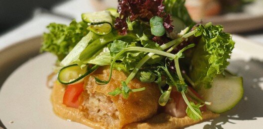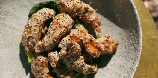Хрустящая панировка и сочная нежная креветка внутри. Крокеты обжариваем до золотистой корочки и дополняем пикантным соусом ромеско на основе печеного перца, дижонской горчицы, растительного масла.