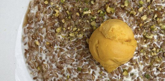 Сливочная полба с сорбетом и кленовым сиропом