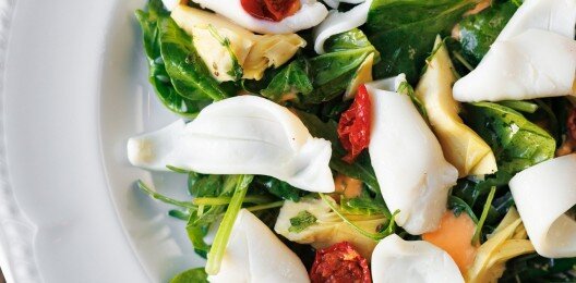 Салат из кальмаров, шпината и артишоков с майонезом из томатов