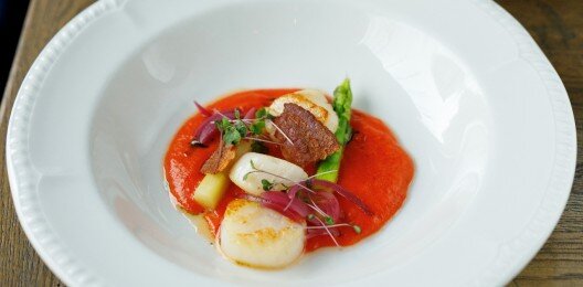 Морские гребешки с кремом из перца с ванилью, спаржей и чипсами из бекона