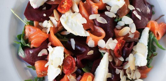 Карпаччо из маринованной свеклы с рукколой, лососем и козьим сыром