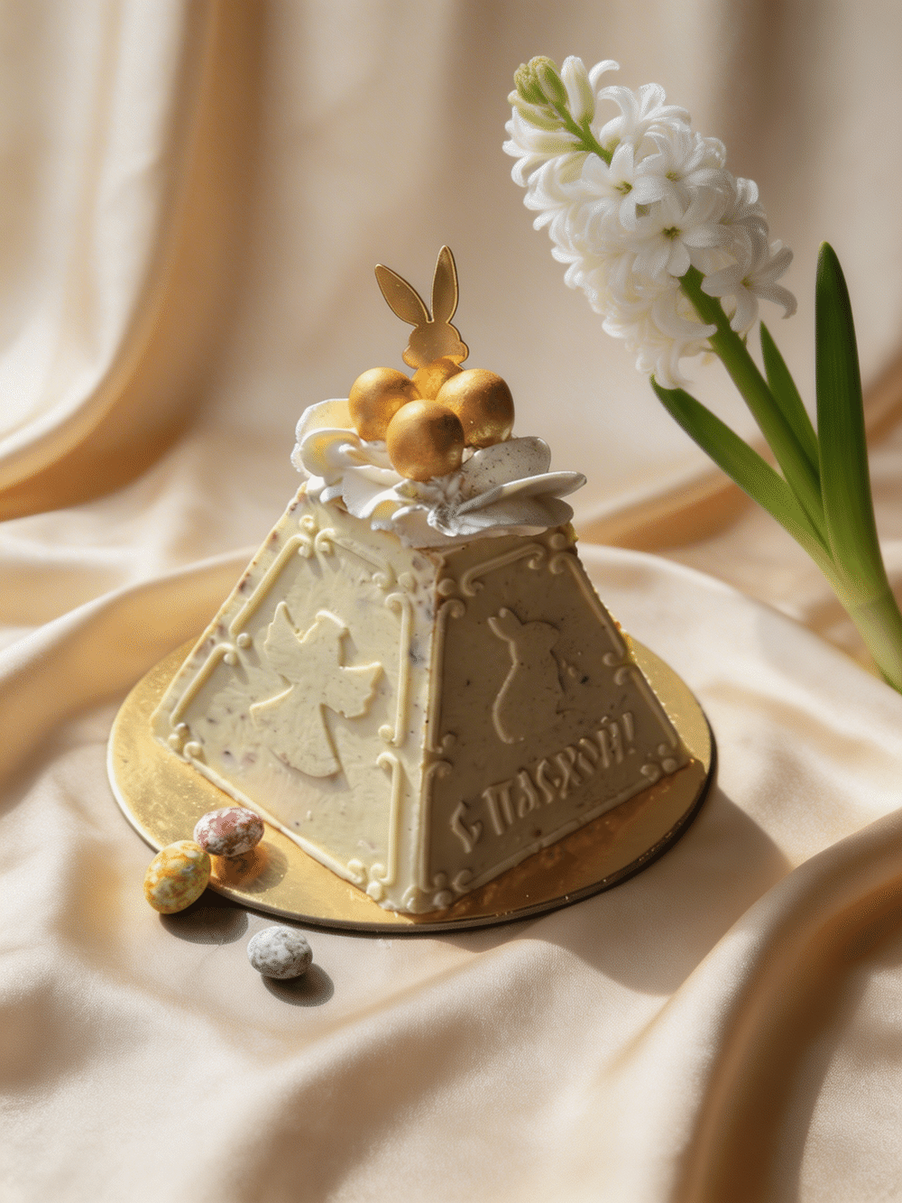 Декор - крем "Шантильи"(сливки, сахарная пудра, экстракт ванили), пищевые блестки "Золото", драже "Перепелиные яйца" , кондитерский топер "Зайчик"