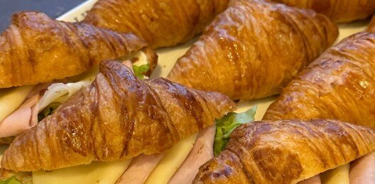 Мини круассан, слабосоленый лосось, крем-чиз с лимоном, лист салата Принимаем предзаказ за 12 часов